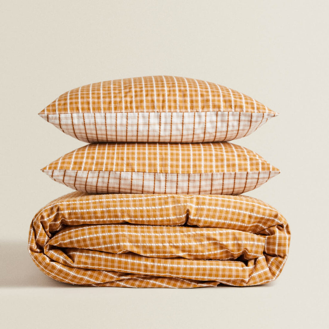 Checked duvet cover in 180 thread count cotton percale. Concealed button fastening at the bottom.