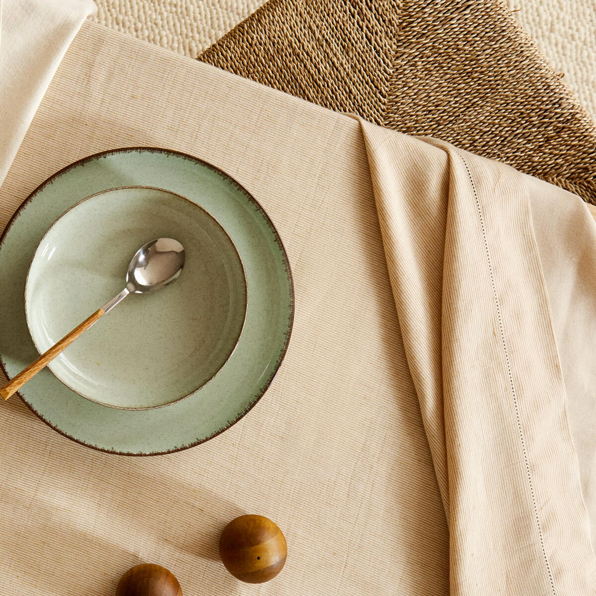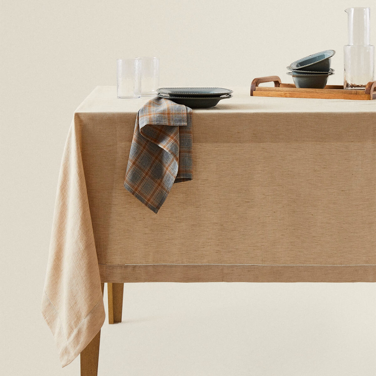 Cotton tablecloth with a striped print on a light background.