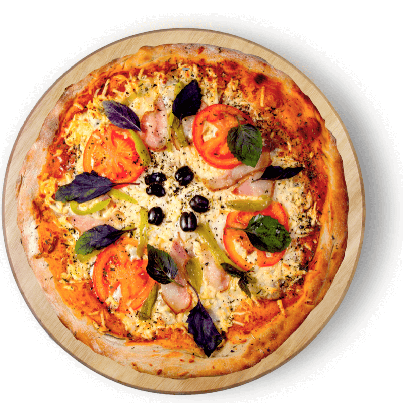 Pizza carbonara consists of a basic pizza dough covered with tomato sauce and topped with slices of salty pancetta, eggs, and cheese